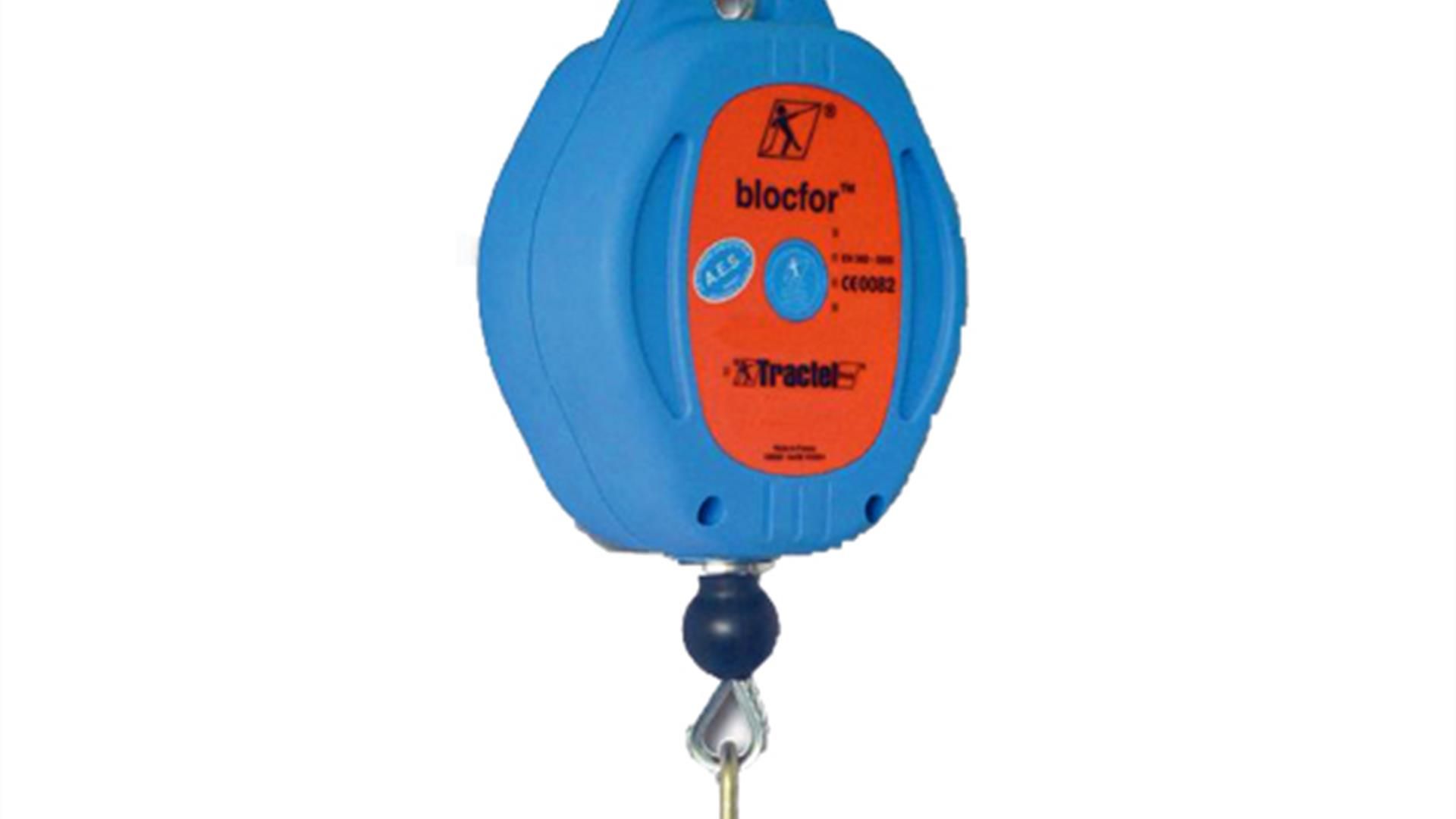 Valblok 10M staalkabel met M10 en M46 haak. Valblok Blocfor met een 10 meter lange staalkabel, conform EN 360, met M10 en M46 haak.